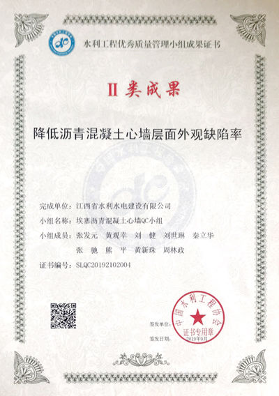 本次大会参报成果690项,涉及全国水利施工、设计、监理、咨询等187家单位。经资料评价和现场发表评价,最终确定522项水利工程优秀QC成果。由我公司廖坊灌区QC小组编写的《降低拱式渡槽拱肋悬链线高度偏差》和埃塞Wolkite沥青混凝土心墙项目QC小组编写的《降低沥青混凝土心墙层面外观缺陷率》两项QC成果荣获2019年水利工程优秀QC成果二等奖(II类奖)。